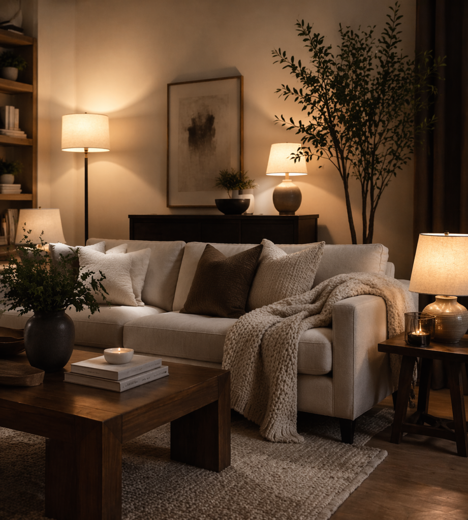If your living room only has the big light, start with one tall floor lamp in a dark corner and one table lamp on a side table or console. That single change can completely change how the room feels at night.